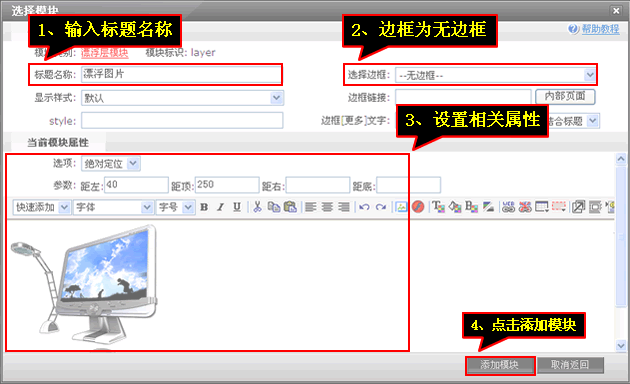 3、输入“标题”,选择“边框”,设置“相关”属性后点击“添加模块”,通过设置参数调整漂浮内容的位置,漂浮内容可以自由编辑。