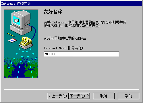 此处填写的是在Outlook express 中您的英文或者拼音名字。它并不影响您的任何工作,只是在您有多个邮箱时可以用来标识是哪个信箱。至此,您已经简单的设置完您的一个信箱。再进行简单的几步设置,就可以开始使用信箱了。